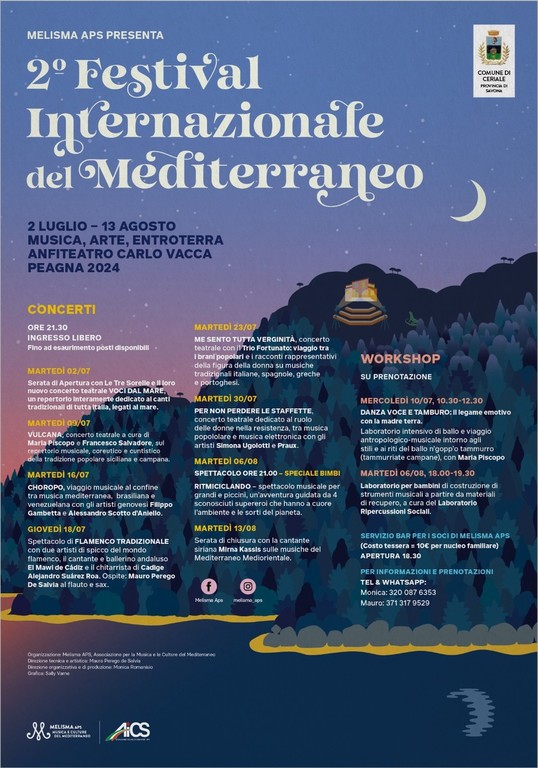 “Un Festival fortemente voluto dall'amministrazione comunale di Ceriale: una rassegna unica in quanto capace di unire musica, arte ed entroterra, per valorizzare e promuovere il nostro magnifico borgo di Peagna e creare momenti di incontro, scambio e intrattenimento intorno al nostro Mediterraneo” hanno sottolineato il sindaco Marinella Fasano e l’assessore alle Manifestazioni Gianbenedetto Calcagno.
