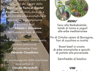 La prima serata sarà dedicata alle erbe aromatiche e spontanee, con piatti curati dagli chef Alessio e Giovanna che si ispirano alla freschezza mediterranea. Il menù, accompagnato dalle melodie all’arpa celtica di Claudia Murachelli e i racconti del giornalista Claudio Porchia, prevede: Taco alla Barbabietola, tataki di tonno e yogurt alle erbe, Plin di Ortiche ripieni di Borragine, Fiori di Zucchino e Ricotta, Roast-beef in Crosta di erbe aromatiche con Spicchi di Patate alla Provenzale, e un Semifreddo al Basilico come dessert. Il sommelier Edoardo Cavallotto ha selezionato i vini da abbinare: Alta Langa Rosè, Cortese dell’Alto Monferrato, Barbera d’Asti, e Moscato d’Asti.