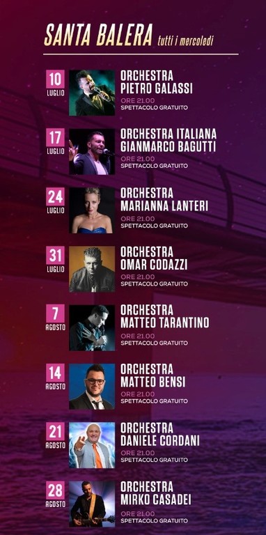 In tutto otto gli appuntamenti in cartellone, di mercoledì sera, iniziati il 10 luglio scorso e che si concluderanno il prossimo 28 agosto: le serate sono gratuite, ma l'organizzazione mette a disposizione anche settanta tavoli, su prenotazione, per possibili consumazioni a pagamento.
