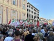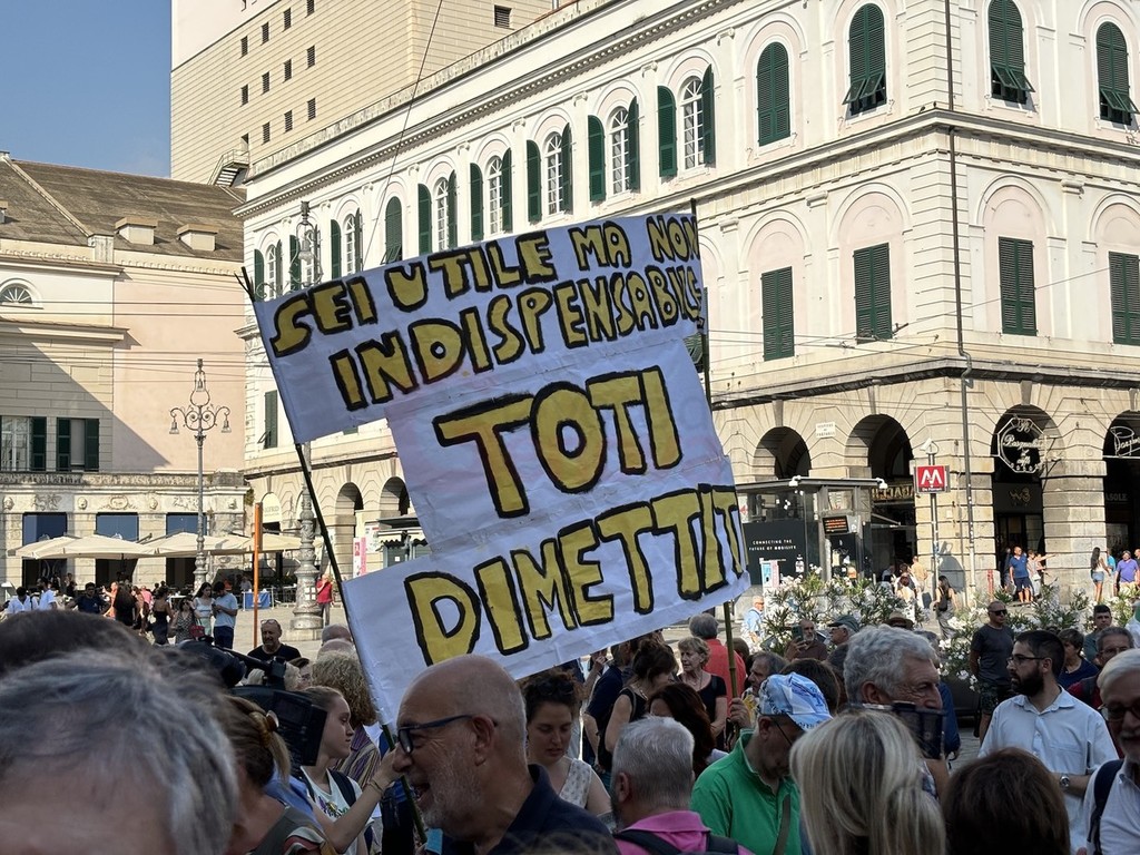 Oltre duemila i manifestanti che si sono radunati in piazza, proprio sotto l’ufficio del presidente Toti, chiuso dal 7 maggio scorso, giorno dell’arresto per corruzione e falso.