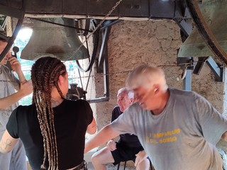 Un momento di festa dove a farci da Ciceroni sono stati il “decano” dei campanari Paolo Naldini, che da oltre 40 anni suona le campane e al quale qualche volta capita di spingersi oltre il Borgo, Danilo Basso, “alunno” di Naldini, e Pietro Vadone, ormai una figura immancabile sul campanile di San Biagio che a soli 21 anni è già membro dell'Associazione Ligure Campanari. Insomma, tre generazioni con melodie tramandate negli anni, ben codificate, ma anche qualche momento più di svago dove questa arte, misto di coordinamento, velocità e forza di braccia, produce delle vere e proprie melodie.