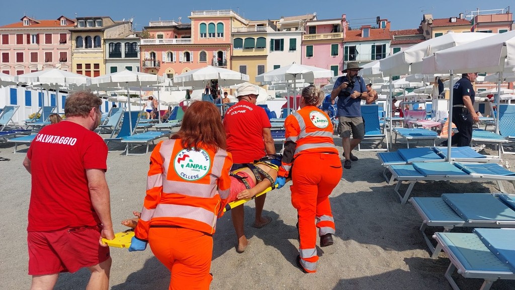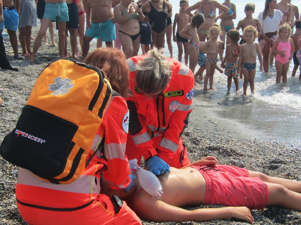 Il soccorso in mare di un bambino in prima battuta con l'ausilio dei bagnini sul moscone e poi in riva con la rianimazione effettuata dai militi della Croce Rosa e il successivo trasporto in ospedale per precauzione.
