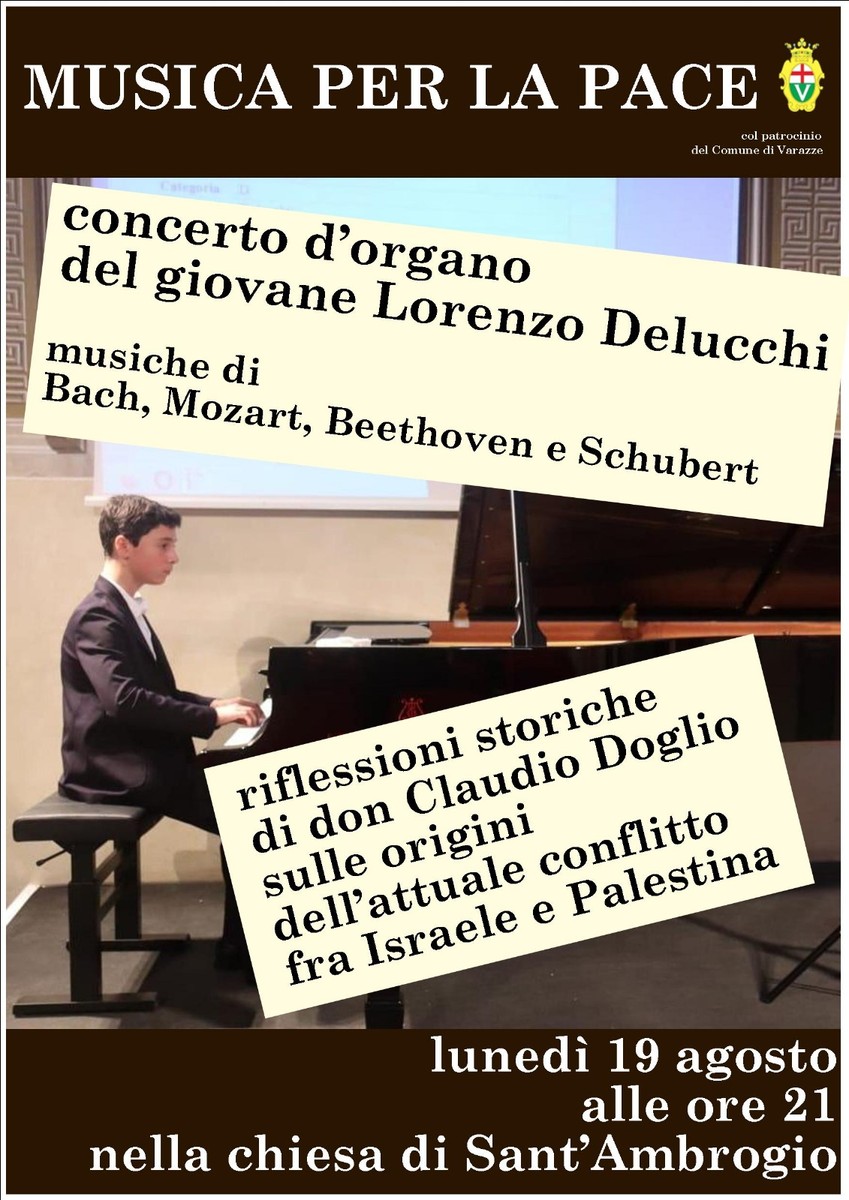 Il giovane e talentuoso organista Lorenzo Delucchi incanterà il pubblico con le sue esecuzioni di brani celebri di Bach, Mozart, Beethoven e Schubert. Ma la musica non sarà l'unico protagonista della serata. Don Claudio Doglio, con la sua profonda conoscenza storica, offrirà una riflessione sulle origini del conflitto israelo-palestinese, invitando tutti a riflettere sulle complessità di questa situazione e a promuovere la cultura del dialogo e della pace.