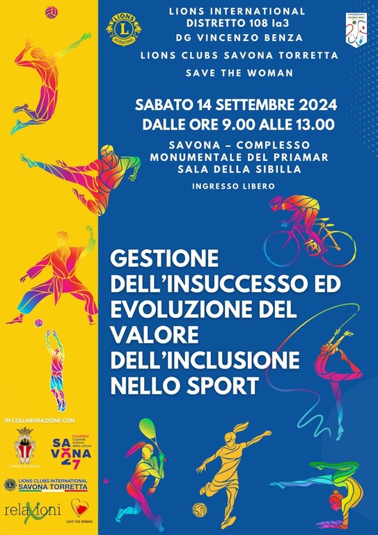 I Lions International Distretto 108 Ia3, il Lions Club Savona Torretta e l'Associazione Save The Woman, in collaborazione con Relaxioni e il Comune di Savona, sono lieti di annunciare un evento di grande rilevanza per il mondo dello sport e la società. Il seminario "Gestione dell'Insuccesso ed Evoluzione del Valore dell'Inclusione nello Sport" si terrà sabato 14 settembre 2024, dalle ore 9.00 alle 13.00, presso la Sala della Sibilla nel Complesso Monumentale del Priamar a Savona. Moderato da Claudio Sabattini Immediato Past Presidente del Consiglio dei Governatori MD 108 Italy