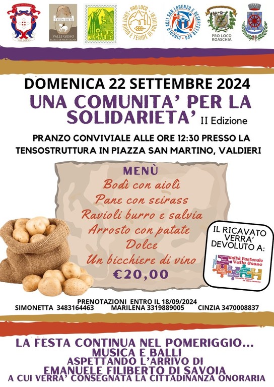 Domenica 22 settembre appuntamento alle ore 12:30 con il pranzo conviviale “Una comunità per la solidarietà” a cura delle Pro Loco locali e il Consorzio “I Balin del Re”. Il ricavato verrà devoluto all’Unità Pastorale della Valle Gesso.