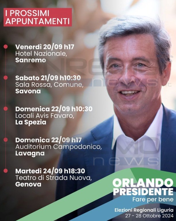 Orlando ha scelto Sanremo per dare il via al primo tour elettorale e, venerdì prossimo (20 settembre, ndr) sarà nella città dei fiori. Per le 17 sarà, insieme a tutto il suo entourage, all’hotel Nazionale di via Matteotti. Gli incontri di Orlando proseguiranno: sabato 21, alle 10.30, nella Sala Rossa del Comune di Savona. Domenica alle 10.30 e alle 17 a Spezia e Lavagna e, infine, martedì prossimo a Genova.