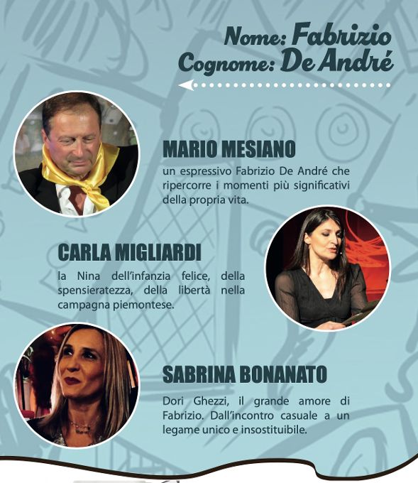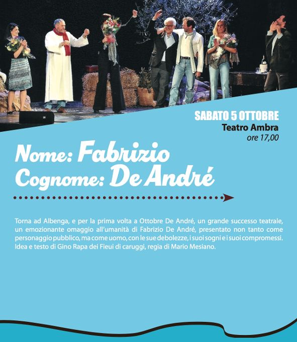 Sabato 5 ottobre, alle ore 17, sul palco del Teatro Ambra per Ottobre De André, la manifestazione ideata e organizzata dai Fieui di caruggi in collaborazione con il Comune di Albenga, andrà in scena "Nome: Fabrizio Cognome: De André". Scritta da Gino Rapa, la rappresentazione è un omaggio all'umanità del cantautore genovese, presentato non solo come personaggio pubblico (Cognome: De André), ma soprattutto come uomo, con le sue debolezze, i suoi sogni e i suoi compromessi (Nome: Fabrizio).