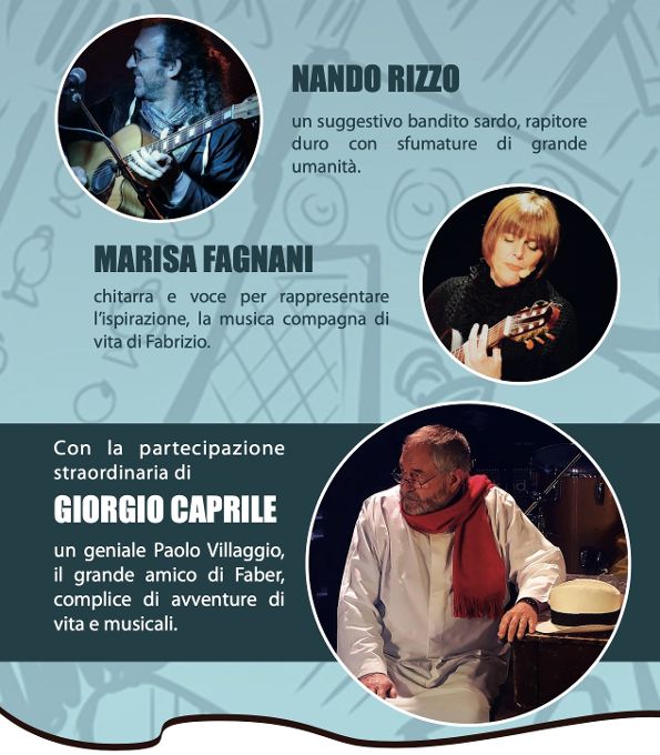 Si tratta di una vicenda suggestiva, capace di fare sorridere e di commuovere nello stesso tempo. Una storia dunque, non un concerto, un percorso teatrale attraverso gli amori, le amicizie, i drammi di Fabrizio De André anche se non mancheranno interventi musicali, affidati alla chitarra e alla calda voce di Marisa Fagnani, simbolo dell’interiorità, dell’ispirazione dell’indimenticato Faber. Presentata per la prima volta nel febbraio 2011 ha sempre fatto registrare ovunque il tutto esaurito con grande successo di pubblico e di critica. Dopo una lunga pausa viene riproposta in previsione di una “ripartenza” a livello nazionale. Nell’occasione saliranno sul palco del Teatro Ambra i protagonisti della prima rappresentazione.