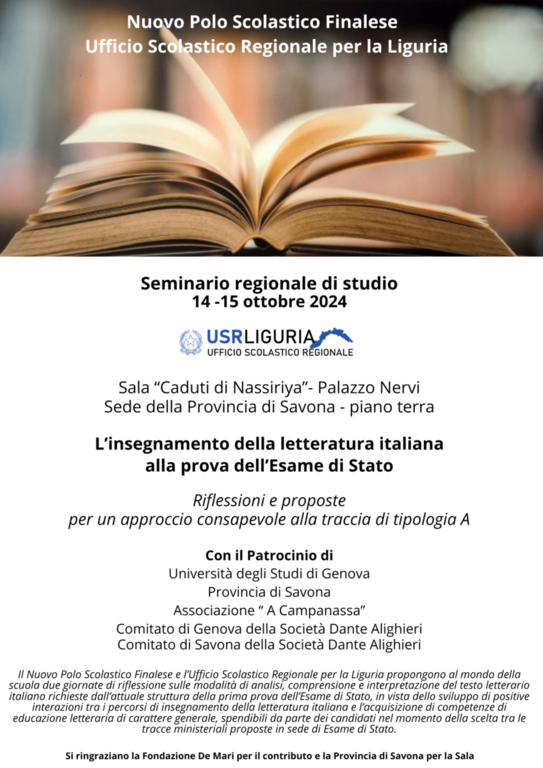 Lunedì 14 ottobre alle ore 9, nella sede della Provincia di Savona - Sala Espositiva “Caduti di Nassiriya”- si aprirà il seminario dal titolo “L’insegnamento della letteratura italiana alla prova dell’Esame di Stato - Riflessioni e proposte per un approccio consapevole alla traccia di tipologia A”, organizzato dal Nuovo Polo Scolastico di Finale Ligure, di concerto con l’Ufficio Scolastico Regionale per la Liguria, con il sostegno della “Fondazione De Mari” e la collaborazione della Provincia di Savona, del Comune di Alassio e del Liceo Chiabrera – Martini di Savona.