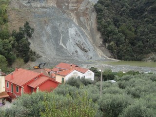 Sono iniziate le operazioni per tentare di aprire il bypass per far defluire le acque del fiume e farle rientrare nella loro sede a seguito della fuoriuscita causata dalla enorme quantità di detriti franata dal versante.