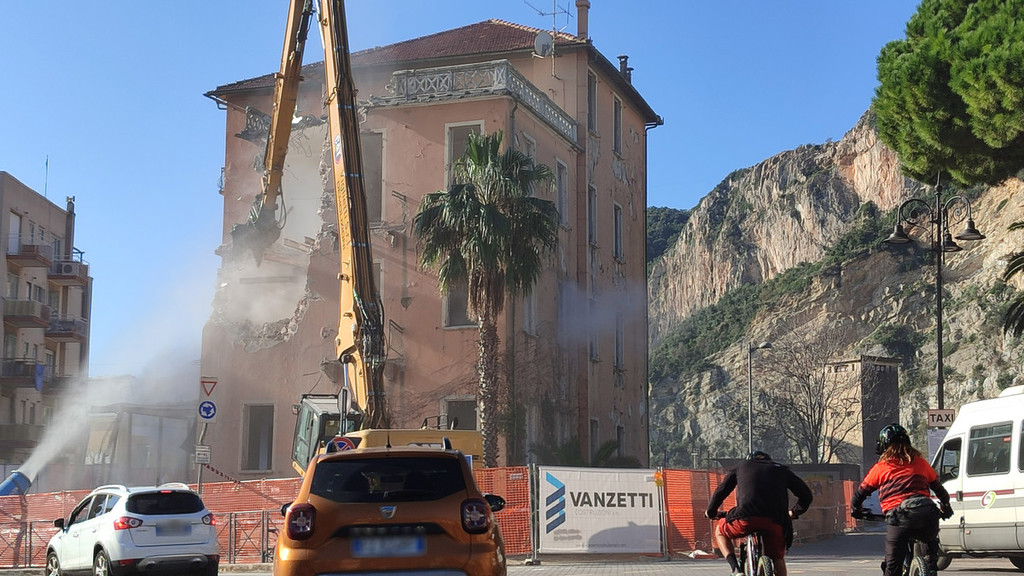 Una nube di sumo, più o meno densa a seconda del momento, avvolge ormai quel che resta, ossia sempre meno, dell'ex Hotel Regina di Finale Ligure.