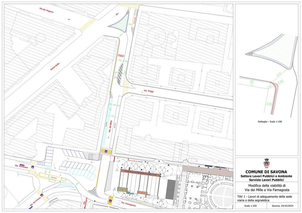 - Via dei Mille: viene istituito il doppio senso di marcia tra via Poggi e via Vegerio e il senso unico verso la piazza, dunque tra via Poggi e piazza Diaz;