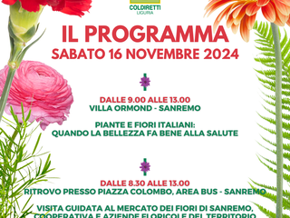La sessione pomeridiana, tecnico-scientifica inizierà alle ore 15.30 presso l’IRF (Istituto Regionale Floricoltura), sarà dedicata a numerosi interventi di ordine tecnico-scientifico. Dopodomani, invece, sabato 16 novembre, si terrà la sessione presso la Serra Pedriali a Villa Ormond, con la Tavola Rotonda "Piante e Fiori: quando la bellezza fa bene alla salute". Si terrà nella Serra in stile liberty anche un Focus sul Ciclamino con uno dei massimi esperti italiani di Ciclamino, oltre a dimostrazioni di flower design e alla visita ai sontuosi giardini della Villa. Sempre sabato 16, in mattinata, si terrà una visita guidata al Mercato dei Fiori di Sanremo, alla Cooperativa Tre Ponti e si andrà alla scoperta di alcune Aziende Floricole del territorio.