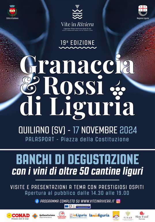 “Come sindaco – commenta Nicola Isetta, primo cittadino di Quiliano -, avendo visto nascere questa iniziativa, sono lieto di poter accogliere ancora una volta le eccellenze vinicole liguri, prendere atto del notevole sviluppo dell’evento e della crescita della qualità del prodotto, anche grazie alla fondamentale partnership con Vite in Riviera, realtà impegnata nella promozione e valorizzazione dei prodotti tipici del ponente. Questa edizione si caratterizza per un calendario particolarmente ricco, in cui spiccano la Masterclass della mattina e la grande vetrina del pomeriggio, con i banchi di degustazione dei vini rossi e rosati di ben sessanta cantine di tutta la Liguria, da Ponente a Levante. Presenti anche aziende agricole quilianesi con prodotti tipici del territorio. Ad arricchire il programma del pomeriggio di domenica 17 contribuiranno le presentazioni dei prodotti De.Co. di Quiliano e di alcuni libri a tema, tra cui “Un mare nel Roero” di Flavio Costa del ristorante 21.9 di Piobesi d’Alba, 1 Stella Michelin. Abbiamo confermato l’accogliente location del Palasport di Quiliano, che sarà per l’occasione vestito a festa, ovviamente a tema di Granaccia & Rossi di Liguria, grazie alla qualificata collaborazione della Polisportiva Quiliano. Un ringraziamento particolare a dunque Vite in Riviera e alla Polisportiva per la collaborazione e l’organizzazione dell’evento ed a Conad Nord Ovest per il supporto”.