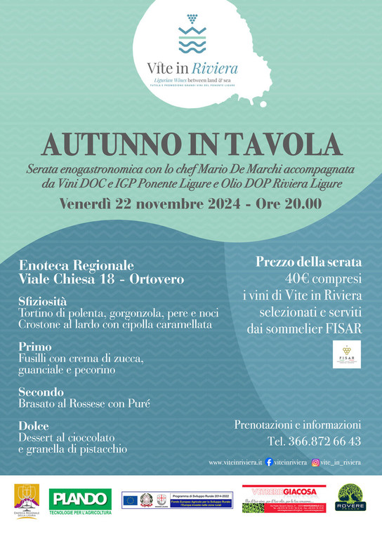 Per quanto riguarda le iniziative di Vite in Riviera, da segnalare l’appuntamento di domani, venerdì 22, presso l’Enoteca Regionale di Ortovero (Sv) con la serata enogastronomica “Autunno in tavola” curata dallo chef Mario De Marchi. Il menù della serata prevede due antipasti (tortino di polenta, gorgonzola, pere e noci; crostone al lardo con cipolla caramellata), un primo (fusilli con crema di zucca, guanciale e pecorino), un secondo (brasato al Rossese con purè) e un dolce (dessert al cioccolato e granella di pistacchio), il tutto accompagnato dai vini delle aziende di Vite in Riviera, selezionati e serviti dai sommelier Fisar. Prezzo della cena: 40 euro, vini inclusi. Posti limitati, prenotazione obbligatoria al 366.8726643.