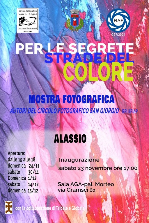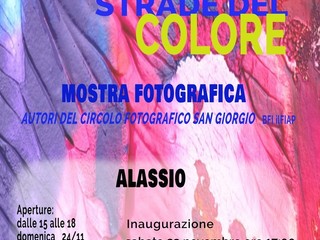L’Associazione Culturale Circolo Fotografico San Giorgio BFI ILFIAP di Albenga, con il patrocinio dell'Assessorato alle Politiche Scolastiche del Comune di Alassio, e sotto l’egida della FIAF, organizza due iniziative, la prima della quali è la mostra dal titolo “Per le segrete strade del colore”, che verrà inaugurata sabato 23 novembre alle ore 17.00 nella Sala AGA di Palazzo Morteo ad Alassio (via Gramsci, 60). Sarà successivamente visitabile nei giorni di sabato 30 novembre, domenica 1 dicembre, sabato 14 dicembre e domenica 15 dicembre dalle ore 15 alle ore 18 (ingresso libero).