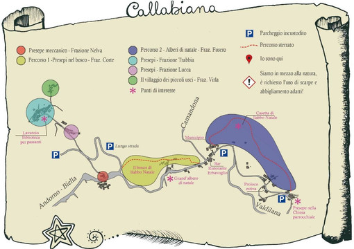 Questo caratteristico borgo Biellese viene spesso denominato il “Paese dei Presepi”, poiché l’oratorio dedicato a San Carlo accoglie durante l’intero anno lo storico presepe meccanico, di ben 80 metri quadrati, visitabile solo durante il periodo natalizio e rappresentante il villaggio natio di Gesù in un paesaggio ispirato al panorama del Biellese, è possibile notare i grandi santuari di Oropa e Graglia. Quest’evento è stato ampliato nel 2018 dall’iniziativa Presepi e alberi di Natale nel Bosco, dove i visitatori, per tutto il periodo natalizio e gratuitamente, possono passeggiare immersi nella natura ed ammirare diverse creazioni, realizzati da studenti della provincia di Biella o da privati che ne fanno richiesta, raffiguranti presepi o alberi di Natale. Ci saranno due percorsi collocati nei boschi delle frazioni di Callabiana e saranno presenti molte sorprese, tutte da scoprire camminando (si veda mappa). Si raccomanda l’utilizzo di scarpe e abbigliamento adatti.