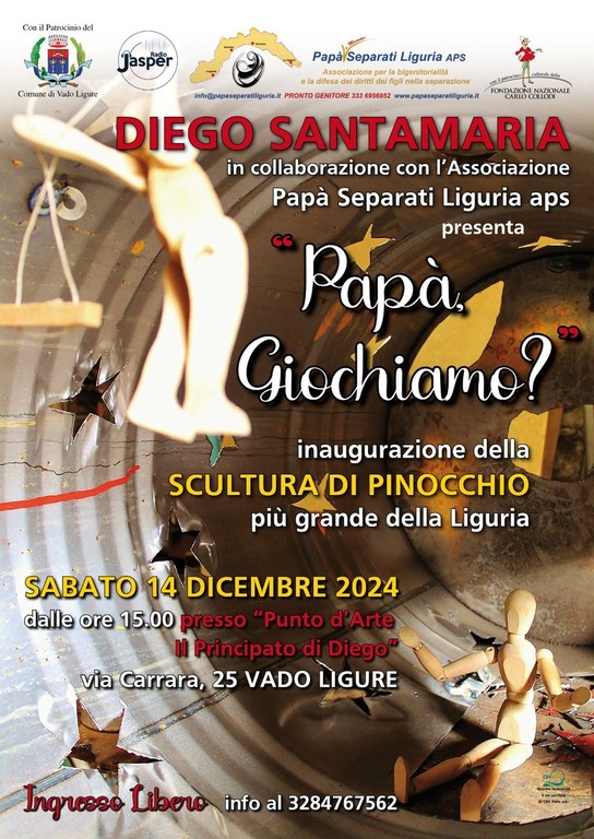 È proprio una sorpresa l'ultima opera inedita dell'artista Diego Santamaria, che richiama il gioco come diritto fondamentale del bambino e che verrà inaugurata alle 15 di sabato 14 dicembre presso lo studio dell'artista in via Carrara 25 a Vado Ligure, per poi rimanere in visione sul posto fino all'estate. Si tratta ad oggi della scultura di Pinocchio più grande della Liguria.