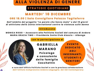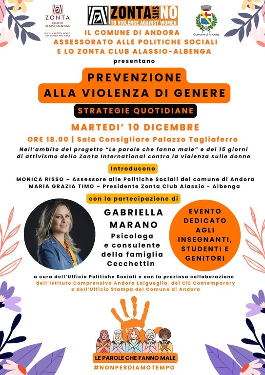 Il Comune di Andora, attraverso il suo Assessorato alle Politiche Sociali, e lo Zonta Club Alassio-Albenga uniscono le forze per promuovere la prevenzione alla violenza di genere con un evento che coinvolgerà insegnanti, studenti e genitori.