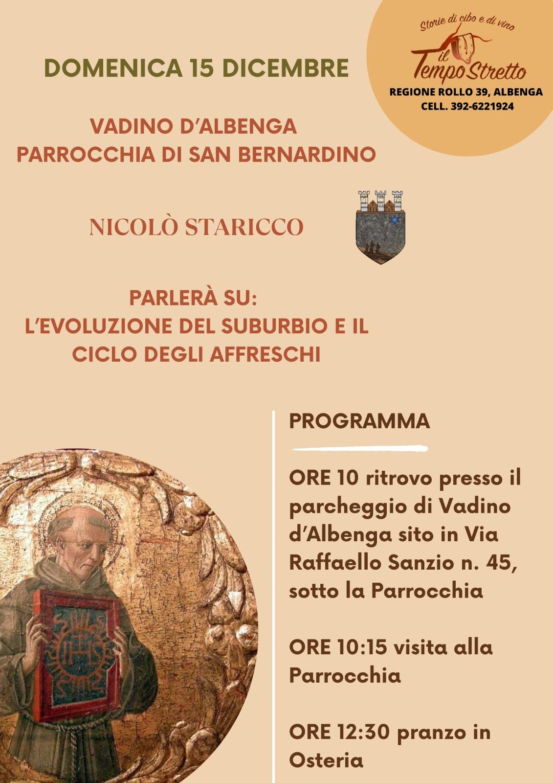 All'Osteria del Tempo Stretto proseguono gli incontri culturali con Nicolò Staricco. Domenica 15 dicembre visita alla Parrocchia di San Bernardino a Vadino d'Albenga, un piccolo gioiello nascosto della città e poi un pranzo speciale all'osteria.