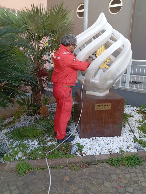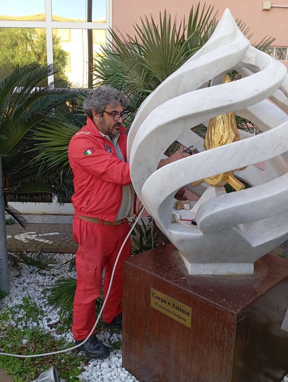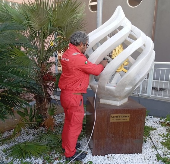 Era stata vandalizzata nel maggio di quest'anno l'opera "Corpo e Anima" presente nel piazzale davanti alla caserma dei vigili del fuoco di Savona ed è stata ristrutturata dall'autore, l'artista e vigile del fuoco Antonio Cursano.