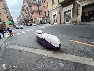 Il proprietario, dopo aver acquistato della frutta in un negozio di via Torino, l'ha riposta nella parte posteriore del suo mezzo e ha ripreso il cammino. Il velomobile, spesso definito "automobile a pedali", è un veicolo a tre ruote caratterizzato da un telaio leggero in materiali come fibra di carbonio e kevlar, e da una carenatura che protegge il conducente da pioggia e intemperie. La propulsione è esclusivamente umana, anche se alcuni modelli possono essere assistiti da un motore elettrico.