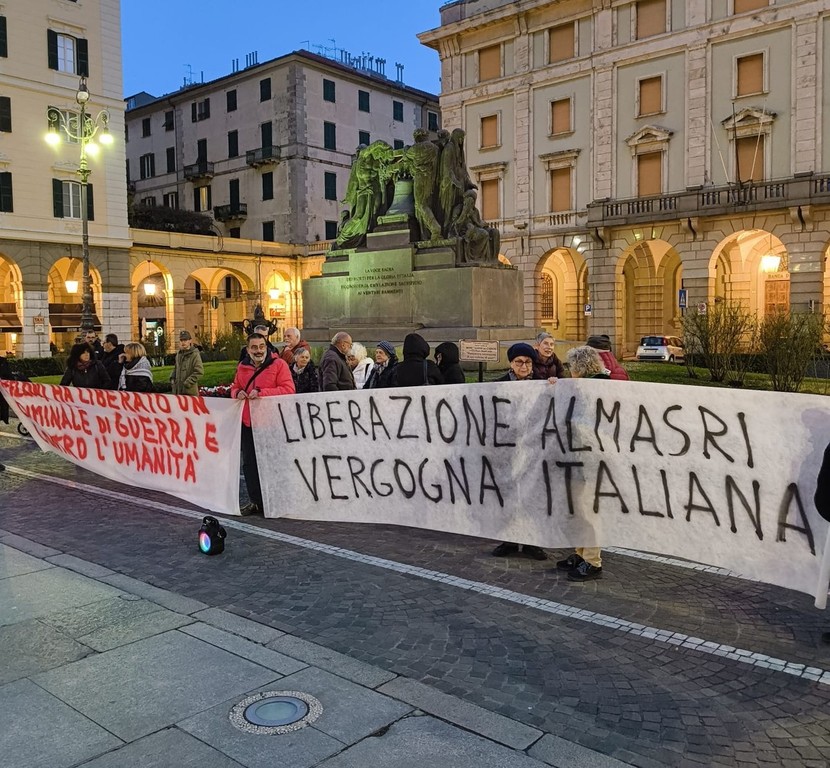 Queste le frasi impresse su due striscioni posizionati in Piazza Mameli a Savona questa sera per protestare contro la liberazione di Njeem Osama Almasri Habish, alto ufficiale della polizia giudiziaria libica.