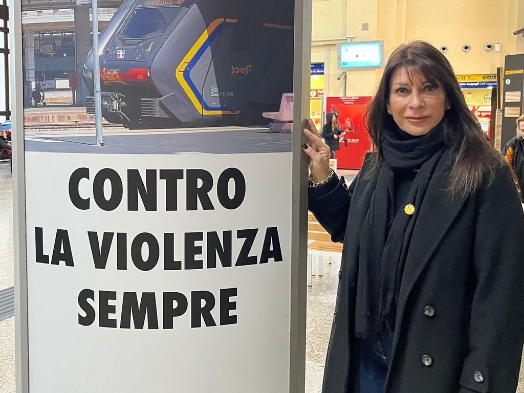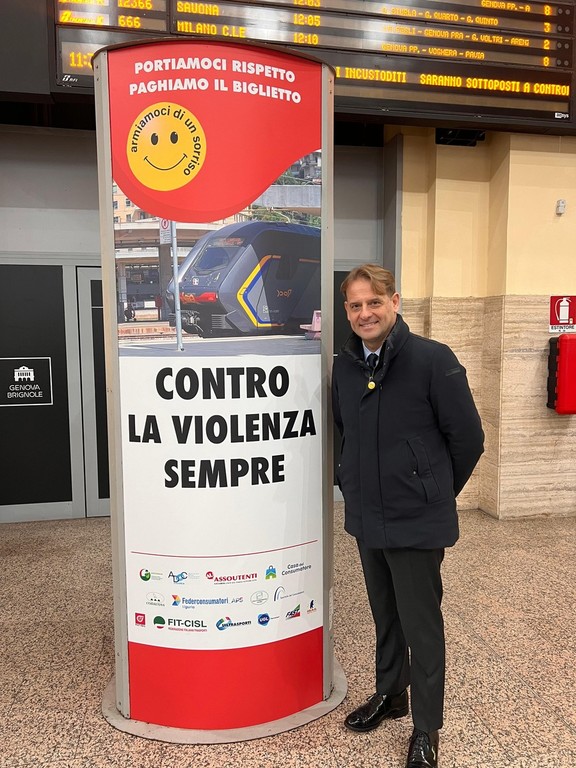 "Contro la violenza, sempre", questo lo slogan che campeggerà su segnaposti e altro materiale che verrà distribuito su tutti i treni regionali della Liguria e sul totem, inaugurato oggi, nel piazzale di fronte alla stazione ferroviaria di Genova Brignole.