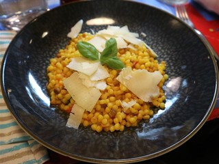 Fregola risottata con zafferano, basilico, pomodoro e scaglie di pecorino: un primo piatto ricco di sapori, dove la fregola si sposa con la delicatezza dello zafferano e il carattere deciso del pecorino sardo.