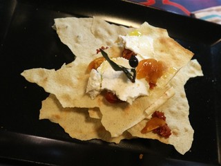 Millefoglie di pane Carasau con Bottarga, primo sale di pecora e pomodorini secchi: un antipasto che cattura l’essenza della Sardegna, unendo la croccantezza del pane Carasau e la sapidità della Bottarga.