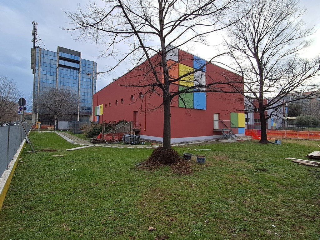 Con i lavori di sistemazione, che hanno seguito quelli della vicina scuola De Amicis, ora la palestra ha anche una nuova veste colorata e integrata con l'edificio scolastico e l'ambiente del parco delle Nazioni.