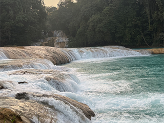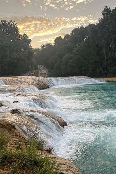 Il giorno seguente la nostra destinazione sono state le cascate di Agua Azul, nascoste nella giungla, lontane dal rumore del mondo moderno. Quando siamo arrivati, il fragore dell’acqua ci ha guidati verso il cuore del luogo; non erano né imponenti né altissime, ma la loro bellezza indiscutibile. La corrente creava una serie di pozze naturali, le tonalità di blu e turchese brillavano al tramonto, contrastando con il verde intenso della vegetazione circostante. Abbiamo camminato lungo un sentiero, ammirando il paesaggio in forme sempre diverse. Fotografare quel momento è stato quasi un dovere: le cascate sembravano ancora più belle attraverso l’obiettivo, come se fossero in posa pronte allo scatto.