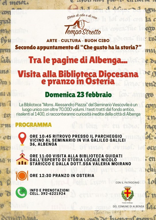L'Osteria del Tempo Stretto vi invita a un'esperienza unica, un connubio tra storia e gastronomia nel cuore di Albenga. Domenica 23 febbraio, immergetevi nelle pagine del passato con una visita esclusiva alla Biblioteca Diocesana "Mons. Alessandro Piazza", scrigno di oltre 70.000 volumi, tra cui preziose testimonianze del 1400. A seguire un delizioso pranzo in Osteria!