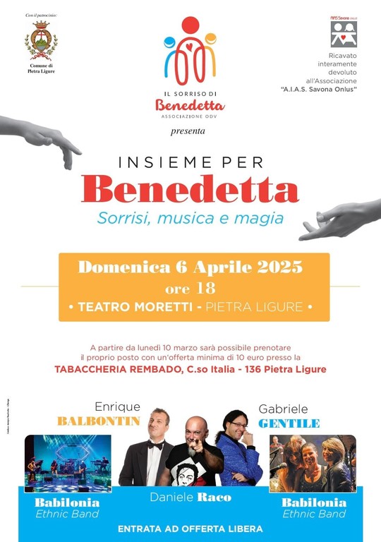 Domenica 6 aprile, alle ore 18.00, il Teatro Moretti di Pietra Ligure ospiterà “Insieme per Benedetta“, un evento all’insegna della musica, della magia e della comicità, organizzato dall'Associazione “Il Sorriso di Benedetta ODV” con il patrocinio del Comune pietrese.