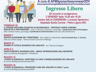 Il 28 febbraio riprendono gli incontri di "Conoscere l'Alzheimer" con il patrocinio dell'Asl 2 Savonese, dell'Ordine dei Medici di Savona e della Provincia di Savona.