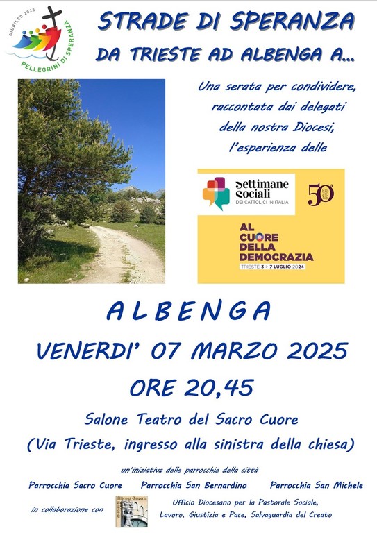 Si svolgerà venerdì prossimo, 7 marzo, alle 20,45 ad Albenga nel salone teatro del Sacro Cuore (Via Trieste, ingresso a sinistra della chiesa) "Strade di speranza: da Trieste ad Albenga a…”
