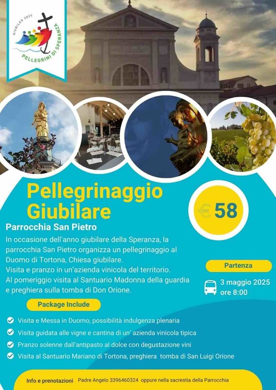 In occasione del Giubileo della Speranza la Parrocchia San Pietro Apostolo di Savona organizza sabato 3 maggio un pellegrinaggio alla Cattedrale Santa Maria Assunta e San Lorenzo di Tortona (Alessandria), nella Regione Ecclesiastica Liguria. Il programma comprenderà la visita guidata e la messa nella chiesa giubilare, con la possibilità dell'indulgenza plenaria, e la visita con pranzo e degustazione in un'azienda vinicola tipica. Al pomeriggio si farà visita al Santuario Nostra Signora della Guardia e si pregherà sulla tomba di don Luigi Orione, fautore della sua costruzione.