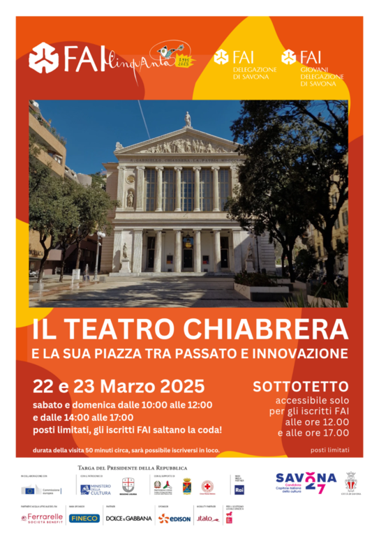 Visto l’impegno profuso dall’amministrazione per la candidatura di Savona come Capitale italiana della cultura 2027, siamo orgogliosi di far scoprire ai savonesi la storia e le particolarità architettoniche di una delle piazze centrali della città e del suo magnifico teatro e di continuare la collaborazione con l’Assessore alla Cultura Nicoletta Negro: "Le giornate FAI sono uno degli appuntamenti più stimolanti a livello nazionale e la nostra Amministrazione è felice che anche l'edizione 2025 faccia tappa in città, con l'apertura del Teatro Chiabrera nella sua parte più inedita e nascosta.