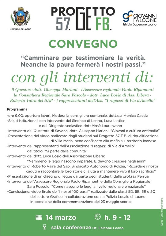 Venerdì 14 marzo, nell'ambito del progetto sulla legalità “57.F.B”, si è tenuto il convegno “Camminare per testimoniare la verità. Neanche la paura fermerà i nostri passi”. L'evento si è svolto nella sala conferenze dell'istituto Falcone di Loano.