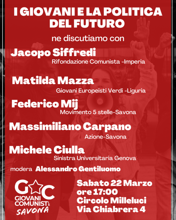 Sabato 22 marzo, alle ore 17.00, a Legino, presso il Circolo “Milleluci” (gentilmente concesso), si ritroveranno, coordinati da Alessandro Gentiluomo: Jacopo Siffredi (Rifondazione Comunista – Imperia, già consigliere comunale a Taggia), Matilda Mazza (Giovani Europeisti Verdi – Liguria), Federico Mij (Consigliere comunale Movimento 5 Stelle – Savona), Massimiliano Carpano (Consigliere comunale Azione – Savona), Michele Ciulla (Sinistra universitaria – Genova).