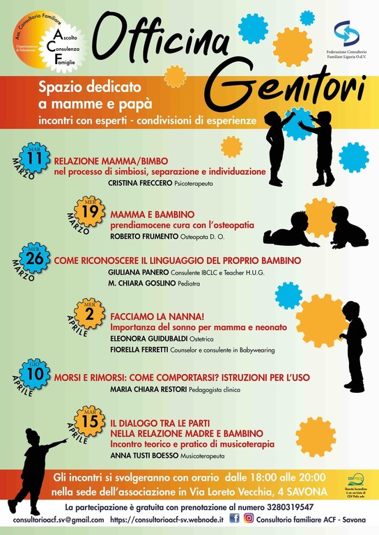 "La nostra peculiarità è sempre stata quella di sostenere il singolo, la coppia, la famiglia tramite colloqui di counseling rispondenti ai bisogni specifici delle persone e consulenze quando necessario - dichiarano i responsabili del consultorio - 'Officina Genitori' nasce dal desiderio dei nostri operatori di attivare azioni concrete sul territorio a supporto della vita dalla nascita in poi, dopo aver partecipato alla formazione 'Percorso nascita 2022-2023', voluta dalla Federazione Regionale Ligure dei Consultori di Ispirazione Cristiana e dalla CFC di Roma, di cui facciamo parte".