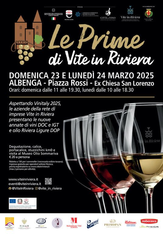 “Le Prime di Vite in Riviera è un evento che celebra il meglio della nostra terra, mettendo in primo piano i vini della rete d’impresa Vite in Riviera, una realtà fondamentale per la promozione delle eccellenze enogastronomiche del Ponente Ligure - conclude Camilla Vio, assessore al Turismo, Eventi e Commercio del Comune di Albenga -. Come Albenga, Città del Vino, siamo fieri di ospitare un appuntamento così significativo, che non solo offre degustazioni e approfondimenti, ma anima l’intero territorio con eventi collaterali che valorizzano le produzioni locali e il nostro patrimonio. L’invito è aperto a tutti gli appassionati di buon vino e buon cibo, per vivere un’esperienza unica tra sapori e cultura”.