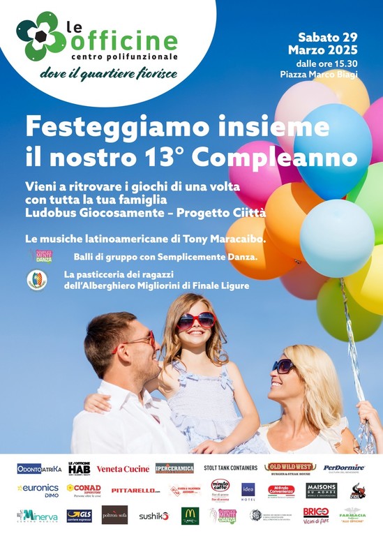 Il Centro Polifunzionale "Le Officine" si prepara a festeggiare il suo 13° compleanno. Sabato 29 marzo, a partire dalle ore 15.30, presso la terrazza del Centro Le Officine in piazza Marco Biagi, è in programma un pomeriggio ricco di divertimento e sorprese per grandi e piccini.
