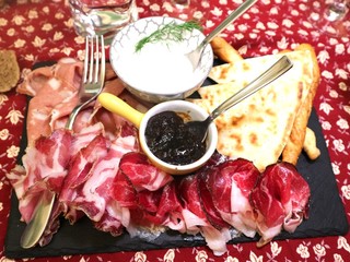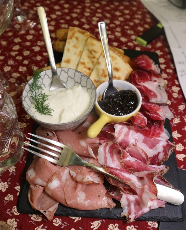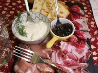 A seguire una selezione di salumi di Mora romagnola, un presidio Slow Food, accompagnati da piadina farcita con squacquerone e fichi caramellati. Questo piatto è stato servito con un bicchiere di "Biagio Antico" Sangiovese Romagna DOC 2023, il quale ha sapientemente bilanciato i sapori con la sua freschezza e succosità, incarnando la vera essenza del Sangiovese romagnolo. La mora romagnola, un maiale dal caratteristico mantello scuro, offre carni di alta qualità, utilizzate nella produzione di una varietà di insaccati apprezzati in tutta Italia. Lo Squacquerone DOP, morbido e cremoso, è da sempre uno dei principali protagonisti della piadina romagnola, definita da Giovanni Pascoli come “il pane, anzi il cibo nazionale dei Romagnoli” e riconosciuta nel 2014 dall'Unione europea con l’Indicazione geografica protetta.