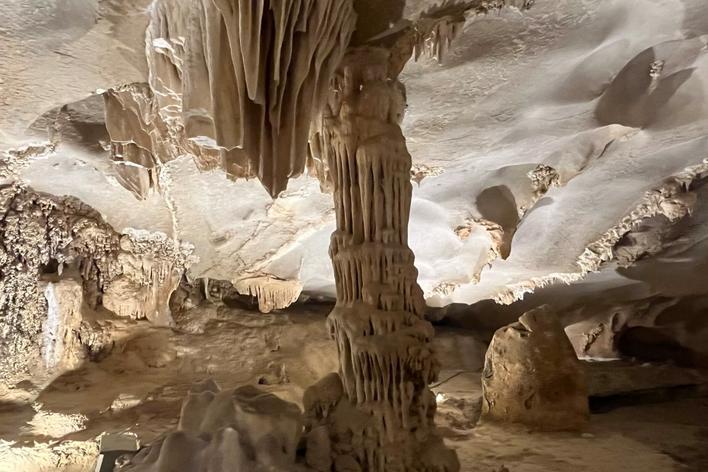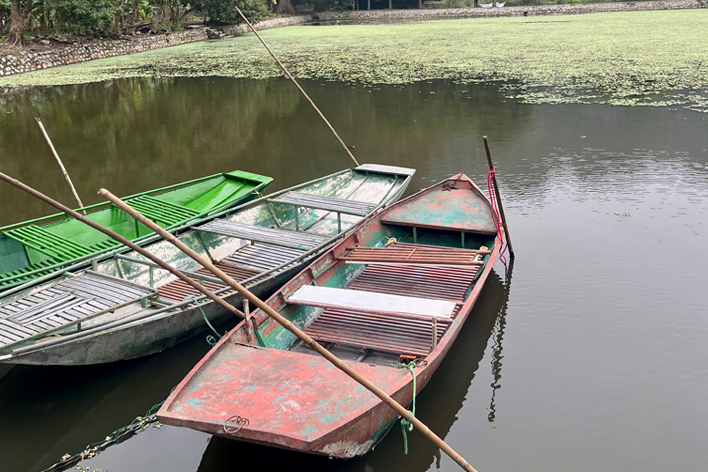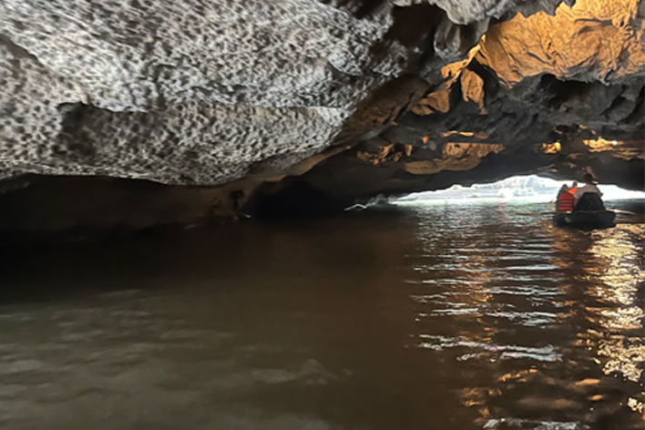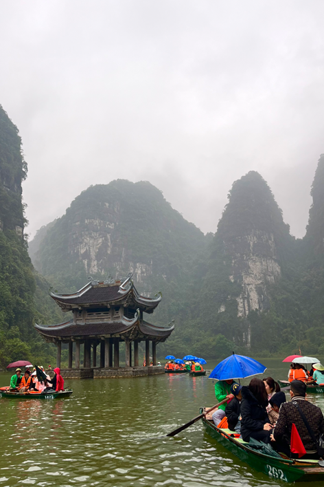 Il giorno seguente abbiamo raggiunto Trang An. Nonostante la vicinanza geografica, il contrasto è stato immediato. Tam Coc ci aveva accolti con un’atmosfera rurale e quasi intima; Trang An ci ha investiti con la forza di una macchina turistica ben oliata. Appena entrati nell’area protetta, ci siamo trovati davanti a un enorme parcheggio pieno di pullman e file perfettamente ordinate di barche in attesa. Il tragitto è durato circa due ore e mezza. Siamo passati attraverso una serie di grotte lunghe e strette, ognuna con un nome evocativo: Sang Cave, Toi Cave, Nau Ruou Cave. L’acqua era immobile come uno specchio e rifletteva le stalattiti e le pareti di pietra in un gioco ipnotico di luci e ombre. In alcuni punti, la roccia ci ha sfiorato la testa! Sulla superficie del fiume, il traffico di barche era continuo. Alcuni tratti del percorso somigliavano più a una tangenziale fluviale, eppure la bellezza del paesaggio era fuori discussione. I templi nascosti sulle rive, raggiungibili solo via fiume, aggiungevano un tocco di mistero e spiritualità. Abbiamo attraccato per visitarne uno: un piccolo santuario immerso nella vegetazione, dove il profumo dell’incenso si mescolava all’umidità del muschio. Uno spettacolo, confezionato in maniera perfetta, per i molti visitatori!