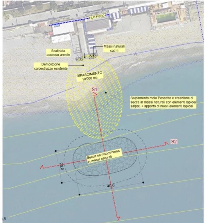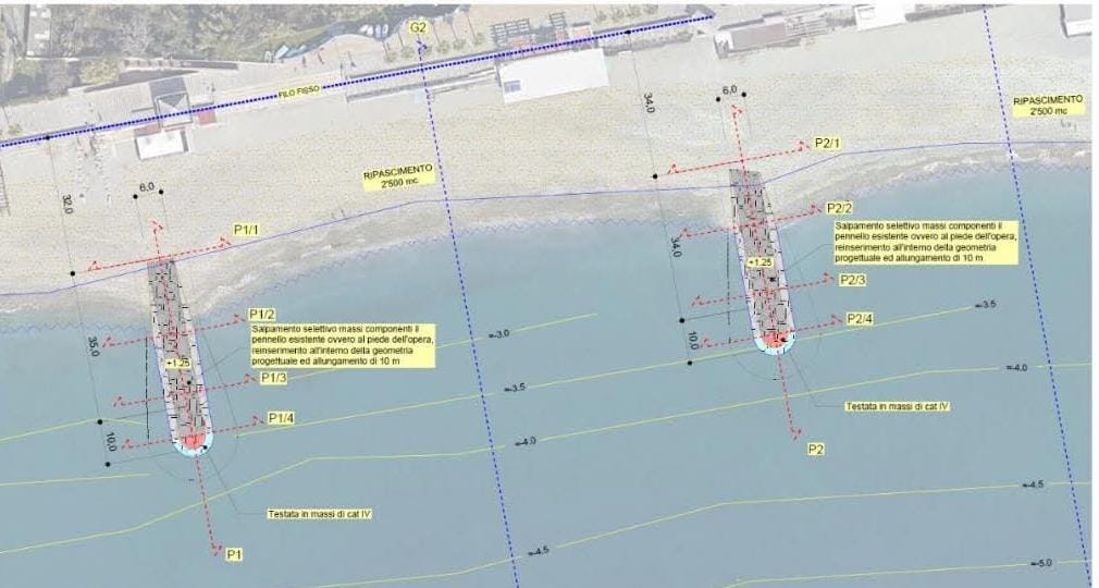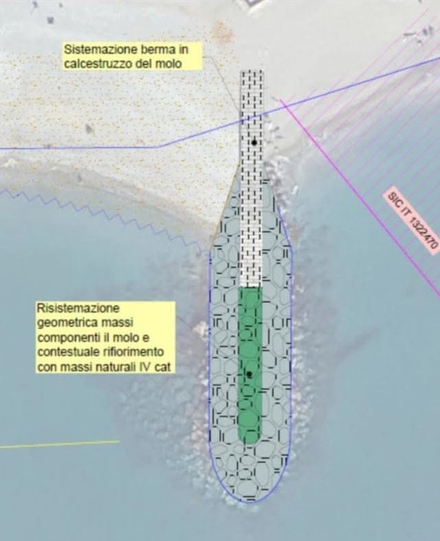 È prevista la rimozione della parte a mare del molo Pescetto, la creazione di una secca semisommersa in materiale lapideo, il ripristino e l'allungamento dei pennelli di levante, la manutenzione del molo Torre e le operazioni di ripascimento della spiaggia con nuovi materiali.