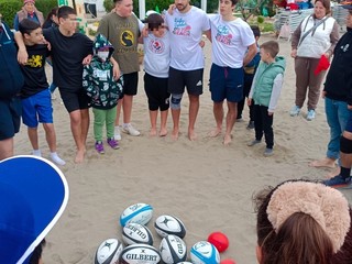 Domenica mattina, poi, tutti in spiaggia a sperimentare lo sport con la palla ovale grazie ai tecnici della ASD Rugby Portatori di Sorrisi APS - Rugby in Ospedale. Il pallone da rugby è rimbalzato in modo creativo e coinvolgente, facendo breccia nel cuore di tutti i partecipanti. Tra sacchi per i placcaggi, percorsi e passaggi, i bambini hanno portato sul campo tutta la loro energia e voglia di divertirsi. Al termine della giornata, medaglie per tutti e foto ricordo. Il sorriso e la gioia dei piccoli campioni, la meta più importante segnata in questi tre giorni di amicizia.