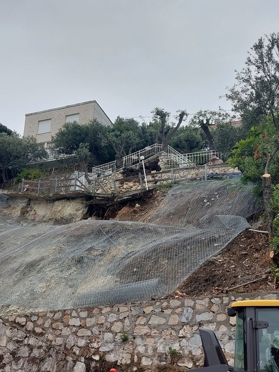 Il tempo incerto ma senza piogge ha concesso, nella mattinata odierna, ai tecnici di effettuare i necessari sopralluoghi per valutare la situazione relativa allo smottamento in corso al di sopra del porticciolo di Capo San Donato, a Finale Ligure.