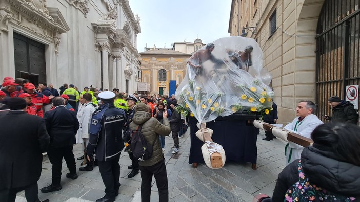 Il cielo era particolarmente scuro e la pioggia era "appesa" ma le 15 casse lignee furono portate, con una scelta last minute, dai "camalli" nel classico percorso "tagliando" solo il transito da Piazza Mameli, via Montenotte e via Astengo.