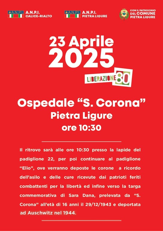 In occasione dell’80° anniversario della Liberazione, le sezioni A.N.P.I. di Pietra Ligure e Calice-Rialto, con il patrocinio del Comune di Pietra Ligure, organizzano una significativa cerimonia commemorativa presso l’Ospedale “Santa Corona”.